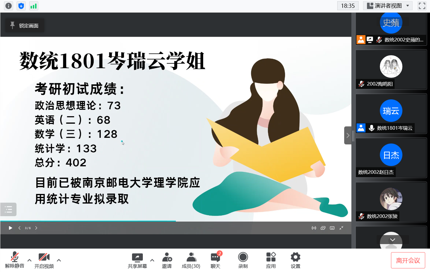 翔宇网4月13日电 (记者 刘晓 睢堰 陶鸣阳)为进一步激发同学们的学习热情,明确学习目标,掌握相关的学习技巧,4月12日,数统2002班于线上召开“良言明方向 学途花自开”学习分享会。本次分享会特别邀请18级学生王彧、岑瑞云、朱汪琪作学习经验分享。会议由数统2002班学生史蘋主持。