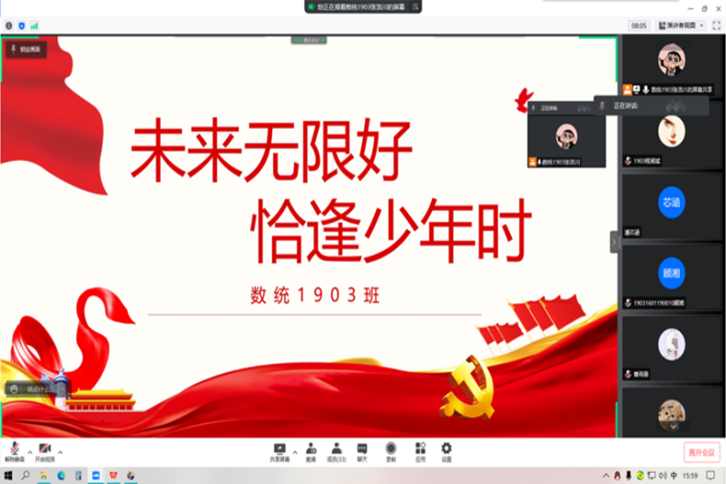 翔宇网4月8日电(记者 程昶斌 顾天尧)为契合数统学院“学习在我,强国有我”的主题教育月思想,4月7日下午两点,数统1903班举行了线上“未来无限好,恰遇少年同”主题教育月活动。此次活动由1903班杨子萱同学主持。