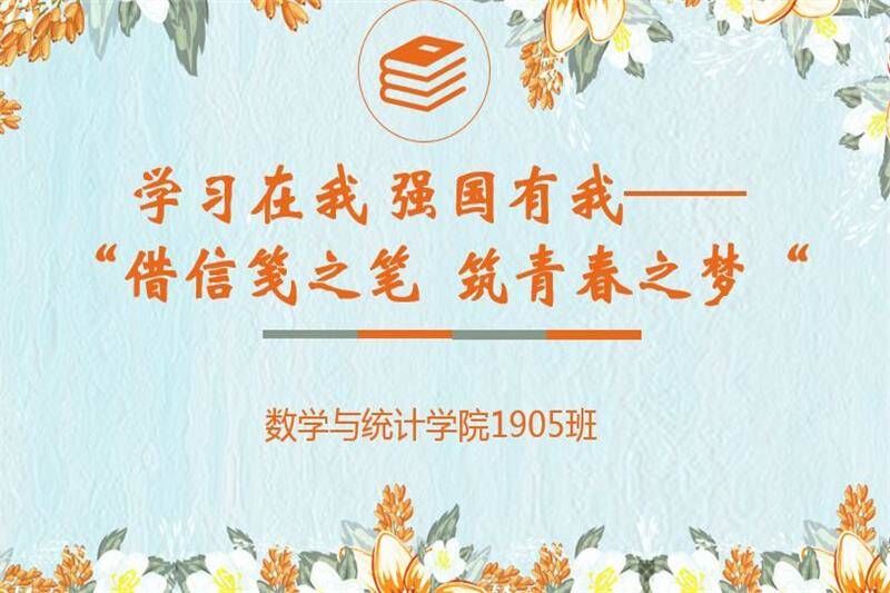 翔宇网4月5日电(记者 许驰)在大学生活的关键转折点,为了更好的推动良好学风的建设,帮助同学们更好的树立下一阶段的发展规划与目标,积极弘扬宣传“奋发进取,青春再出发”的核心精神正能量,对此数统学院1905班于3月23日至4月4日举办“学习有我 强国在我——借信笺之笔,筑青春之梦”的主题团日活动,由缪佳清和许驰同学携手共同完成。