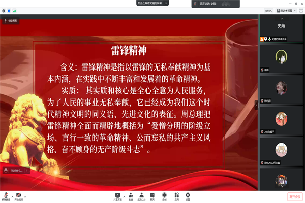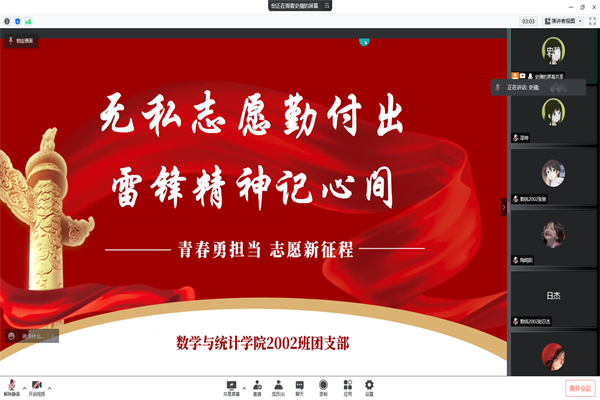 翔宇网3月4日电 记者(邵帅 刘晓)为宣传雷锋精神,提高学生思想道德素质,数统学院2002班于3月3日中午开展了线上“无私志愿勤付出,雷锋精神记心间”主题团日活动,本次班团活动由团支书史蘋主持。