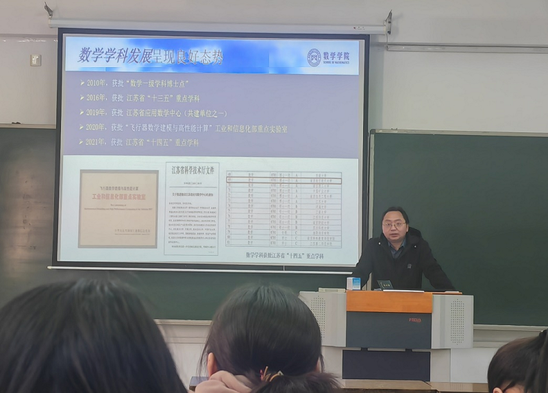 讲座伊始,周良强教授从学院概况引入,向同学们介绍了南京航空航天大学数学学院的历史沿革与学院概况,激发了学生们对于考研院校的向往与思考。他带领学生由浅入深,从学院基本概况到特色发展战略,使同学们更加全面具体的了解到学校的基本情况。