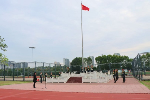 晨光熹微中,师生们列队整齐、昂首肃立。伴随着雄壮激昂的《义勇军进行曲》,鲜艳的五星红旗冉冉升起,迎风飘扬。全体师生神情庄重,行注目礼,齐声高唱国歌,歌声铿锵有力、回荡校园。