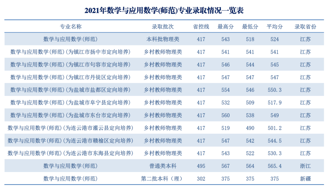 数学与应用数学专业为国家一流本科专业,“数学”学科为江苏省重点建设学科。本专业具有60余年的办学历史,专业师资力量雄厚,教学条件优良,学生学习风气浓。毕业生就业竞争能力强,深受用人单位的欢迎,近年来就业率均保持在98%以上,其中考研考编率已连续多年保持在70%以上。直接就业的学生主要在中小学从事数学教学和教学研究,能胜任班主任工作和其他教育工作,很多毕业生成为江苏教育战线、机关企事业单位的中坚力量。